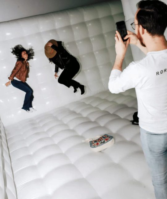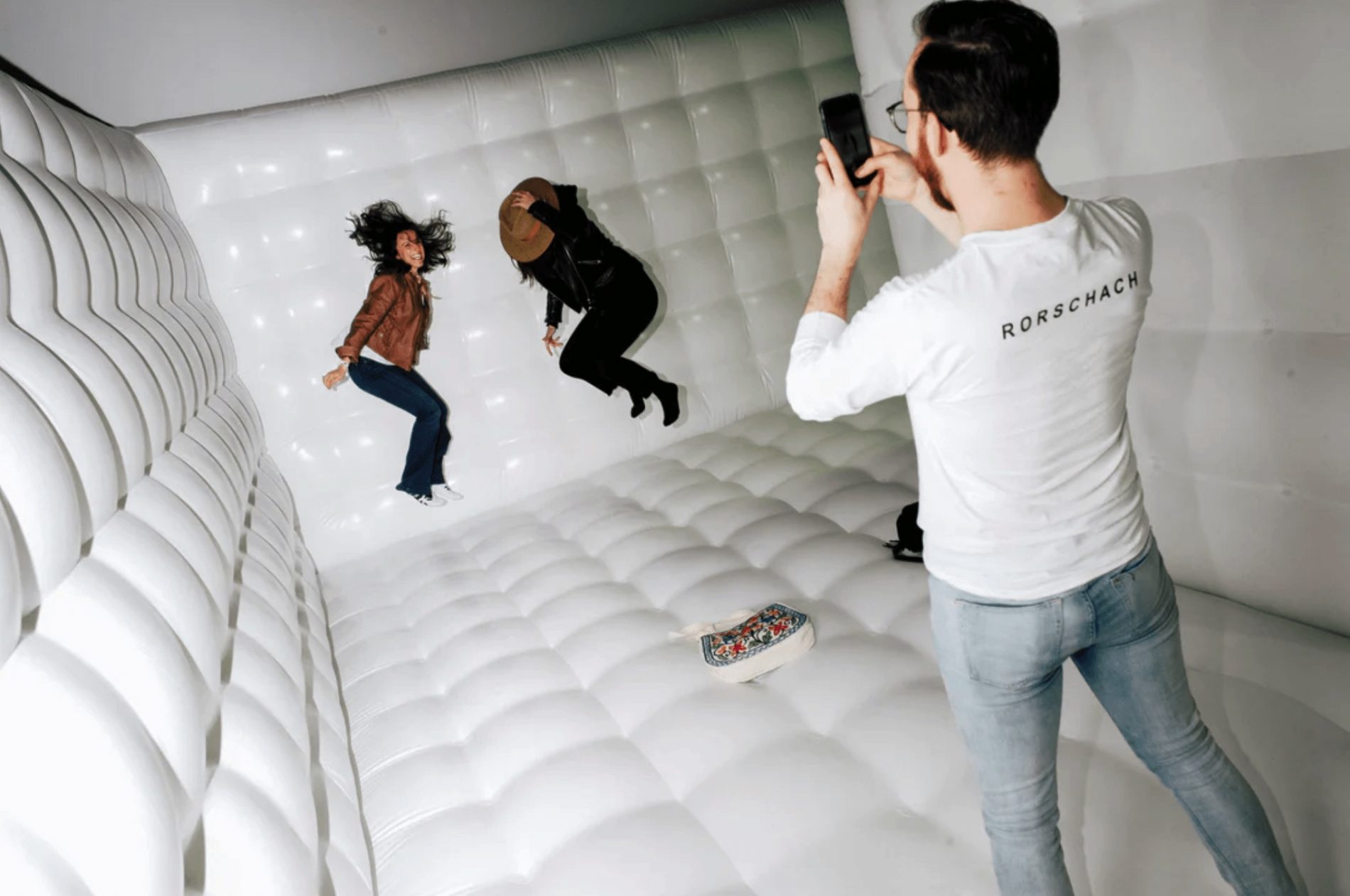 Beyond her drawings, Cj Hendry is also known for encouraging her fans to actively view her work through interactive installations. “I would love for each original artwork to only be able to be viewed as the entire experience; it brings such a greater depth to the genre of hyperrealism,” Cj says. Take, for example, her 2023 exhibition Plaid, for which she created a huge, immersive playground inside a 5,000-square-foot venue in Brooklyn. Her 2021 exhibition Blonde, which explored the transformative powers of wigs, took place in a plush pink beauty salon with 5,000 wigs in 200 different styles to complement Cj’s intricate pencil drawings of multi-colored hairpieces. And two years earlier, Rorschach led guests through a white bouncy castle (with vibes that were equal parts funhouse and madhouse) to reach her inkblot test-inspired drawings. Visitors even donned hospital band-like bracelets reading “Rorschach Psychological Institute.”